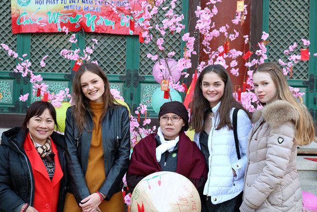 Sư cô Thích Nữ Giới Tánh chụp ảnh với khách quốc tế ghé thăm sự kiện.