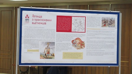 Một không gian ngập tràn không khí nước Việt cổ tại sảnh lớn của Học viện Ngoại giao Moskva (gọi tắt là MGIMO): Tấm phông lớn trang trí hình ảnh bản đồ Việt Nam bằng những biểu tượng cổ; với những hình ảnh và thông tin như một triển lãm nhỏ về Thời đại Hùng Vương, Văn hóa Đông Sơn, trống đồng và cách thức tổ chức lễ hội Hùng vương….