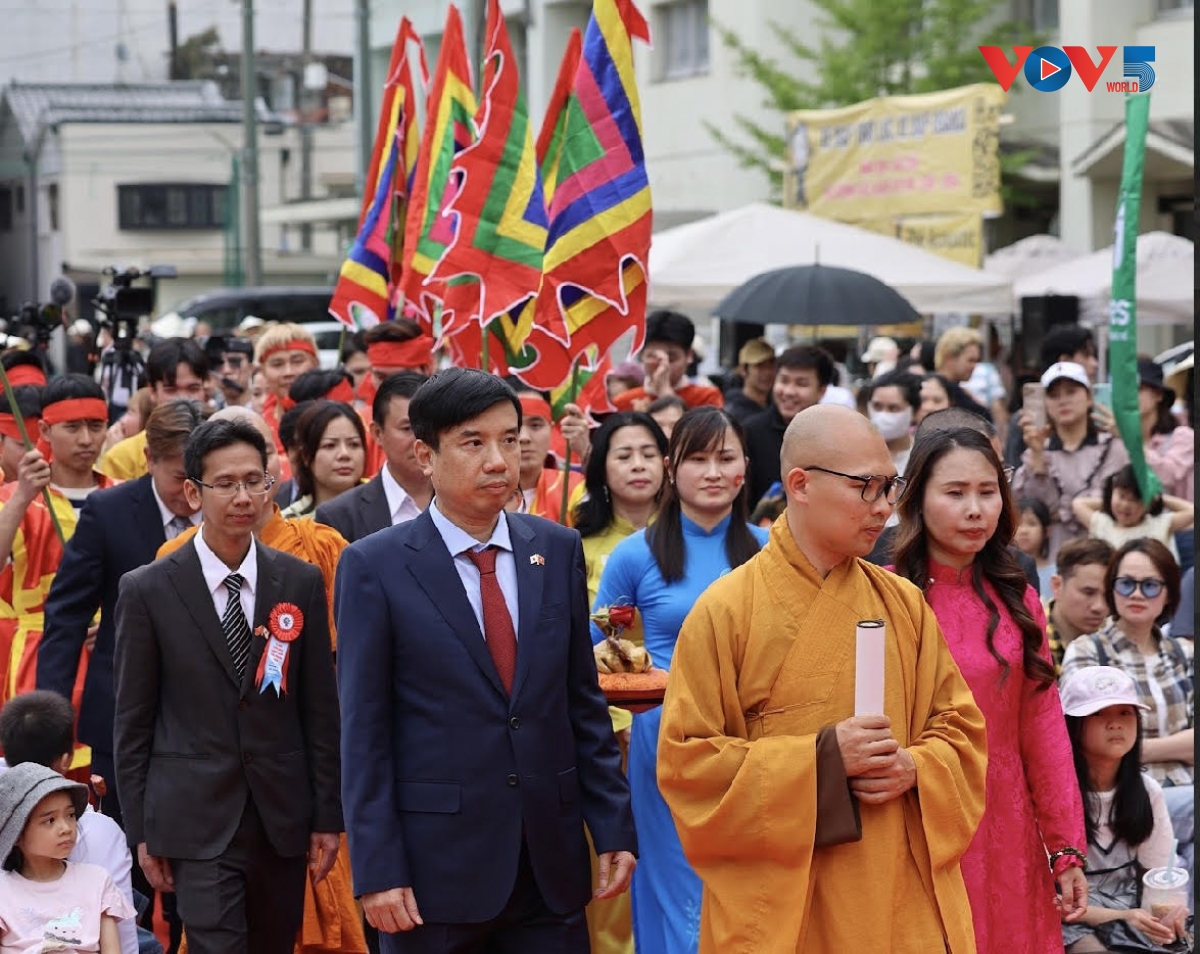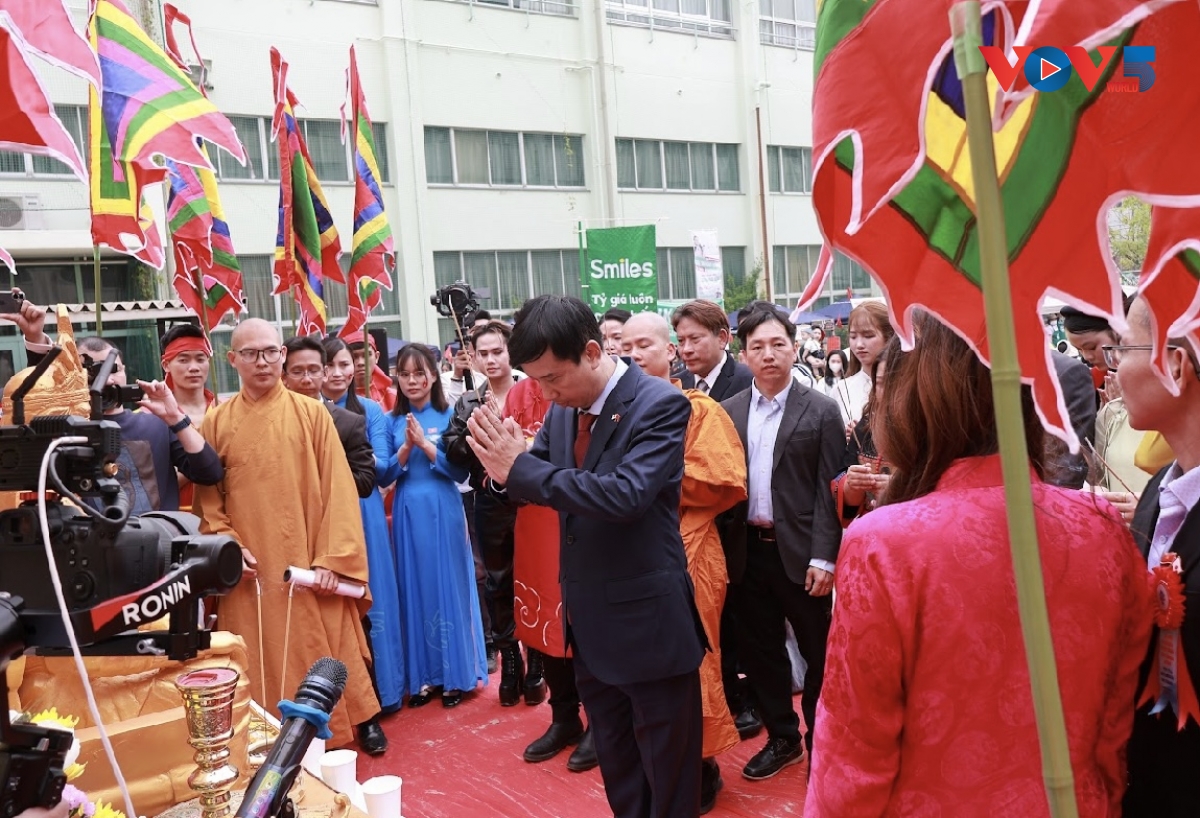 Trong không gian trang trọng của lễ hội, cộng đồng người Việt tại vùng Kansai cùng đông đảo kiều bào và khách quốc tế đã thành kính thực hiện nghi thức dâng hương, tưởng niệm các Vua Hùng – những người có công dựng nước. Hoạt động được tổ chức trang nghiêm, tái hiện nhiều yếu tố truyền thống, qua đó mang đến không khí linh thiêng, gợi nhắc sâu sắc về cội nguồn dân tộc giữa lòng Nhật Bản.