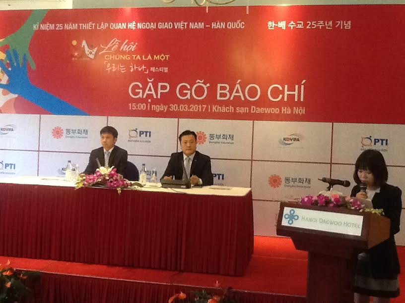 Chiều 30/3, tại Hà Nội, Hội Hữu nghị Việt - Hàn, Tập đoàn Dongbu (Hàn Quốc) và Tổng công ty Cổ phần Bảo hiểm Bưu điện Việt Nam phối hợp tổ chức họp báo giới thiệu Lễ hội Việt Nam - Hàn Quốc mang tên “Chúng ta là một - We are together” sẽ được tổ chức vào ngày 29/4 tại thủ đô Seoul, Hàn Quốc. Đây là hoạt động kỷ niệm 25 năm thiết lập quan hệ ngoại giao Việt Nam - Hàn Quốc (22/12/1992 - 22/12/2017).