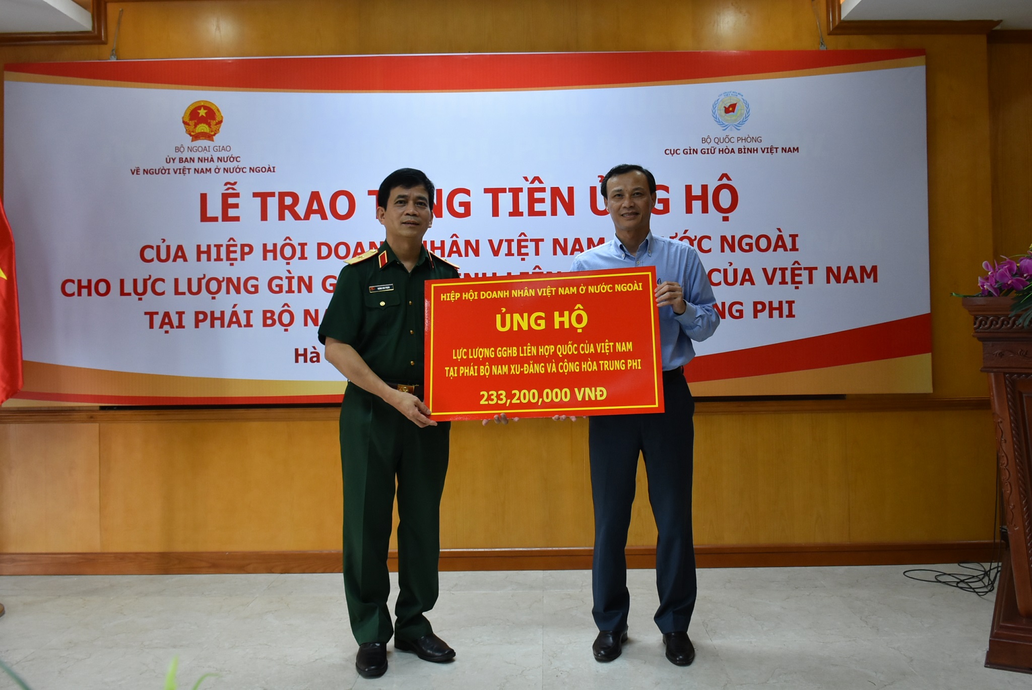 Phó Chủ nhiệm Lương Thanh Nghị cho biết đây số tiền quyên góp của cộng đồng doanh nhân Việt Nam ở nước ngoài thông qua Hiệp hội gửi đến các cán bộ, chiến sỹ Quân đội nhân dân Việt Nam đang thực hiện nhiệm vụ gìn giữ hoà bình Liên hợp quốc của Việt Nam tại Nam Sudan và Cộng hòa Trung Phi.