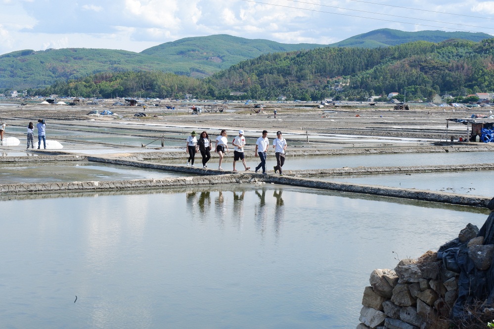 Đồng muối Sa Huỳnh thuộc địa phận xã Phổ Thạnh, huyện Đức Phổ, tỉnh Quảng Ngãi được hình thành từ thế kỉ 19 và được người dân duy trì hơn 100 năm nay. Từ đường quốc lộ 1A rẽ vào, các thanh niên kiều bào đã trầm trồ khi nhìn thấy những ô vuông muối nối tiếp nhau lung linh, óng ánh dưới ánh nắng mặt trời, sát bên đường là những đụn muối được phủ bạt chất cao. Chị hướng dẫn viên vừa chỉ tay xuống đồng muối nơi có những người dân đang khum người cào muối, vừa nói: “Nghề làm muối là nghề nặng nhọc. Bởi công việc phải làm việc ở ngoài đồng, thường xuyên tiếp xúc dưới cái nắng gắt của miền Trung. Những người diêm dân ở đây rất chịu thương chịu khó thì mới có thể bám trụ và gìn giữ nghề này cho đến ngày hôm nay”.