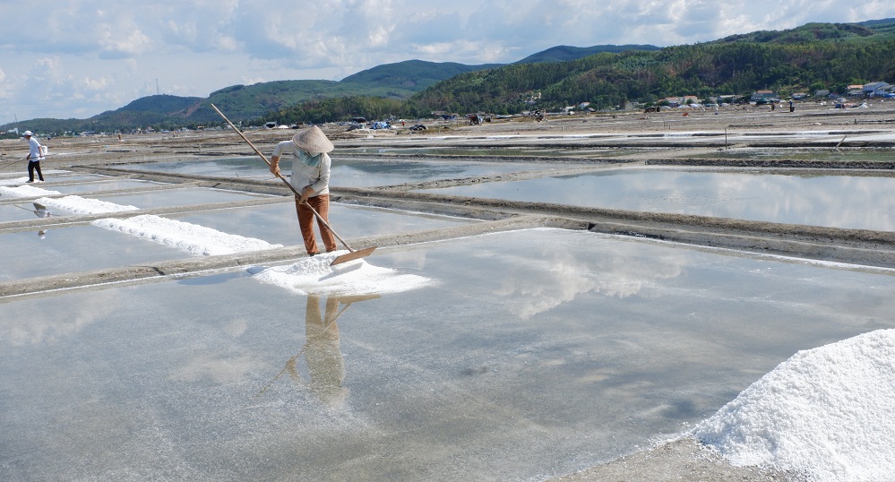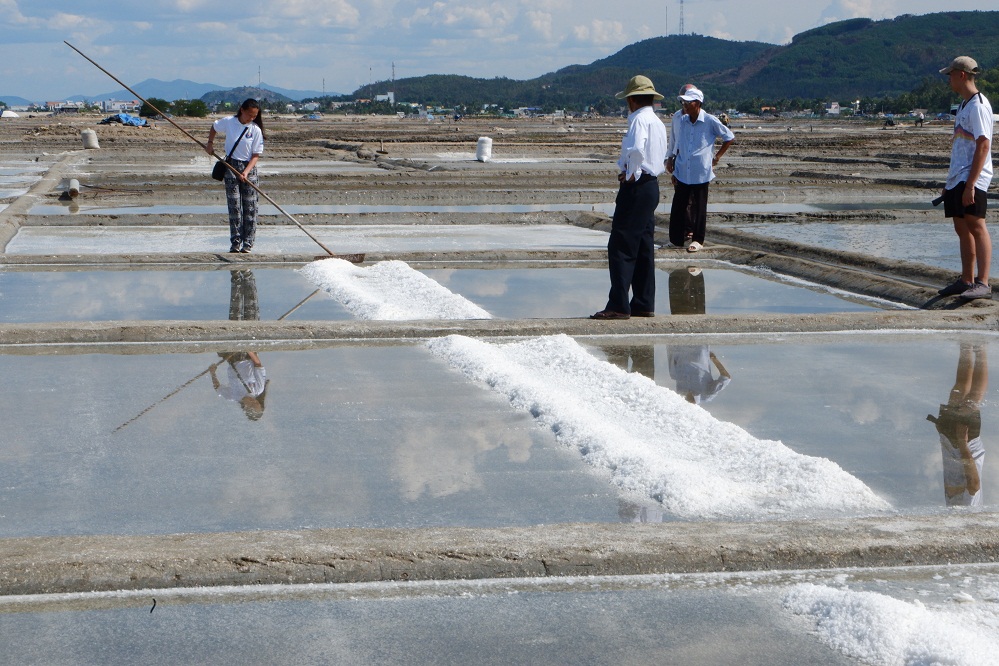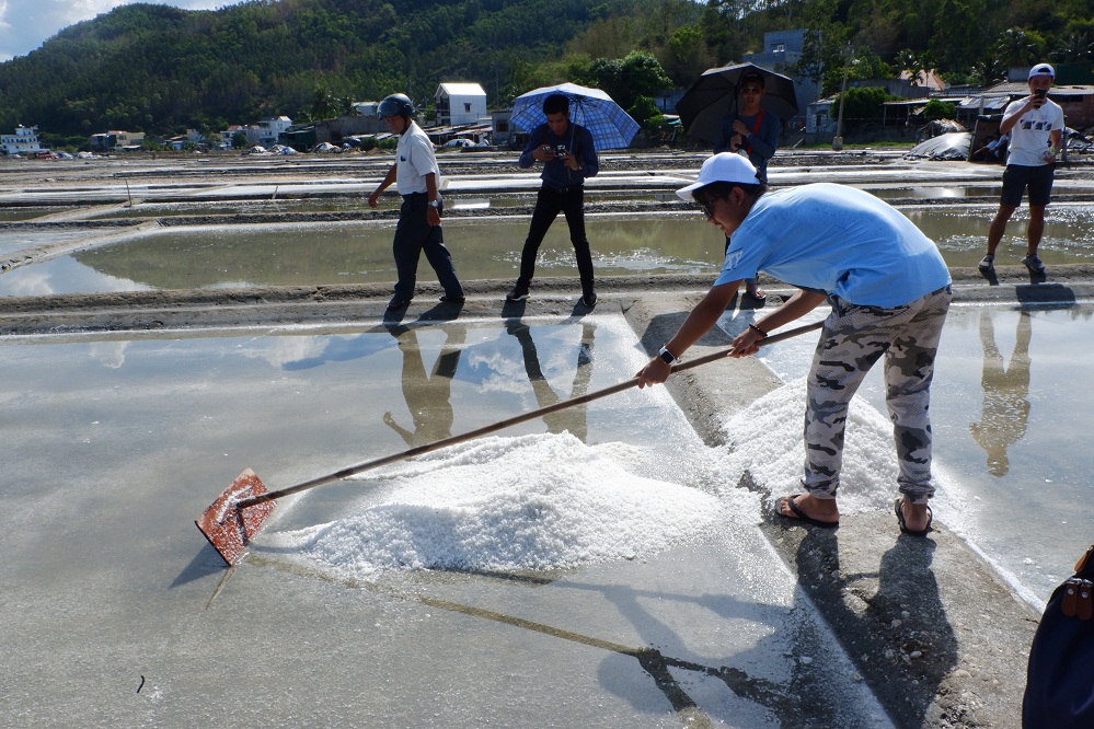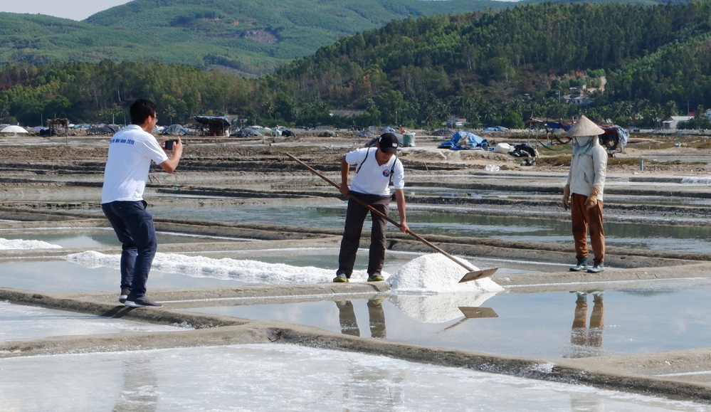Để thu được những mẻ muối chất lượng đến tay người tiêu dùng, trên các thửa ruộng được chia thành các ô vuông vắn, giữa cái nắng ban trưa của miền trung, người dân Sa Huỳnh vẫn miệt mài, cần mẫn dùng bàn cào để xới muối. Tào Thanh Bình, kiều bào Đức, lần đầu tiên đến đây và cũng lần đầu tiên nhón tay, nếm thử hạt muối ngay trên ô ruộng sắp thu hoạch: “Em chưa bao giờ được đến cánh đồng muối nào khác ngoài cánh đồng muối này. Em tận mắt nhìn thấy họ sản xuất muối từ tự nhiên không phải từ máy móc. Làm muối rất vất vả và chỉ mùa hè thì mới làm muối được hiệu quả. Tuy nhiên, người dân ở đây làm việc vất vả mà thu nhập không được nhiều. Các bạn kiều bào đến đây hỗ trợ được đôi phần cho người dân, em thấy rất là vui và hạnh phúc”.
