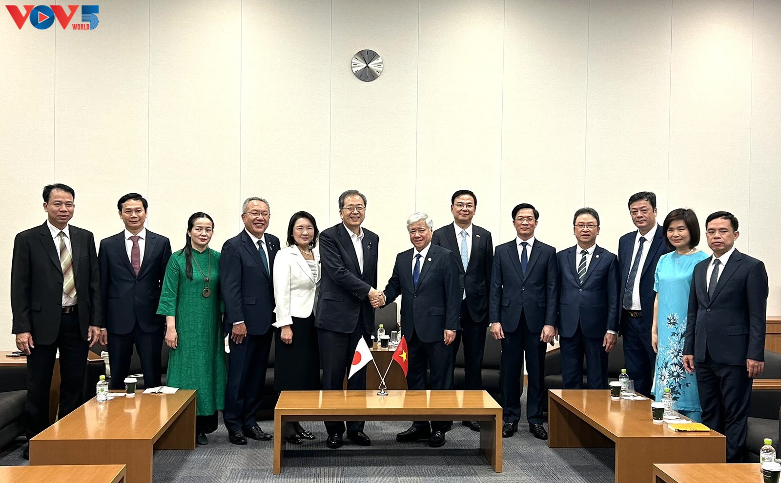 Ông Đỗ Văn Chiến và ông Saito Tetso (giữa) cùng đoàn Việt Nam tham gia cuộc gặp. Ảnh: VOV |