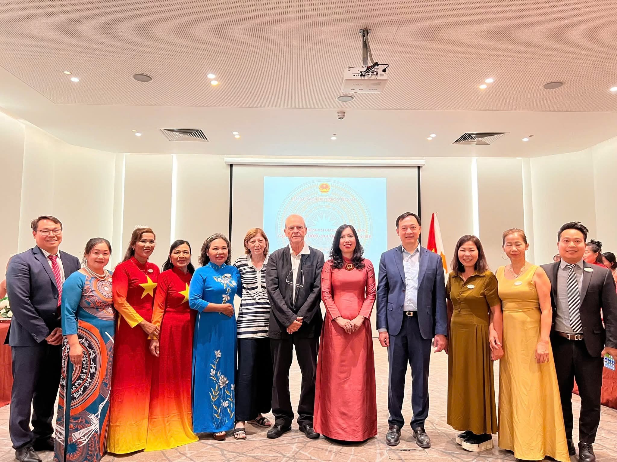 Đại diện Ban lãnh đạo Cộng đồng người Việt Nam tại CH Síp, Lãnh sự danh dự Việt Nam tại Síp, ông Georges On.Christophides chụp ảnh lưu niệm trong chuyến thăm của Thứ trưởng Bộ ngoại giao Lê Thị Thu Hằng tới CH Síp.
