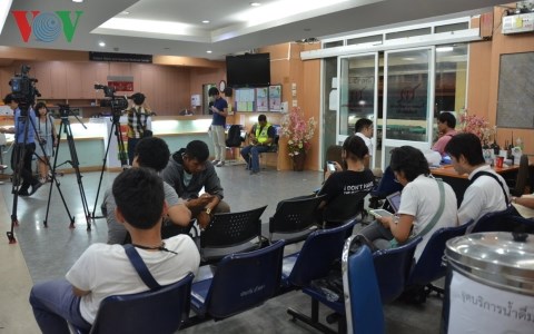 | Phóng viên các cơ quan truyền thông Thái Lan thức trắng đêm tại 15 bệnh viện đang điều trị hơn 100 nạn nhân bị thương trong vụ nổ tối 17/8 |