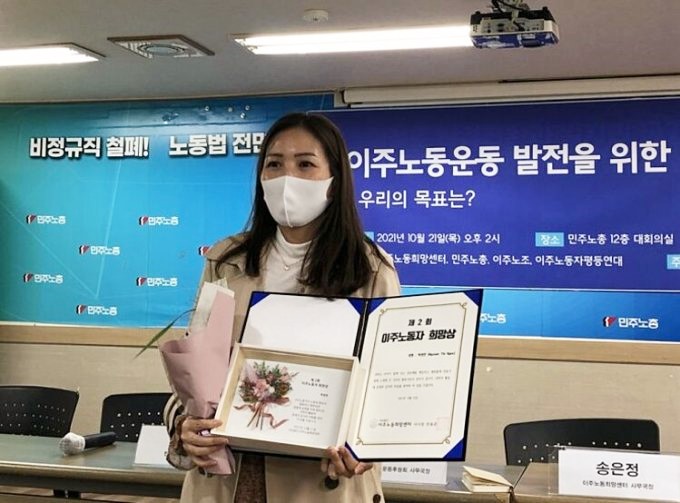 Nguyễn Thị Ngọc nhận giải cống hiến vì người nhập cư tại Trung tâm Cư trú Dành cho người nước ngoài ở Busan ngày 21/10. Ảnh: Trung tâm Hy vọng dành cho Lao động nhập cư |