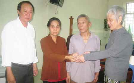 | Đại diện UBND phường An Lạc và bà Đỗ Uyển Như trao tiền hỗ trợ vợ chồng ông Hơng (đứng giữa). |