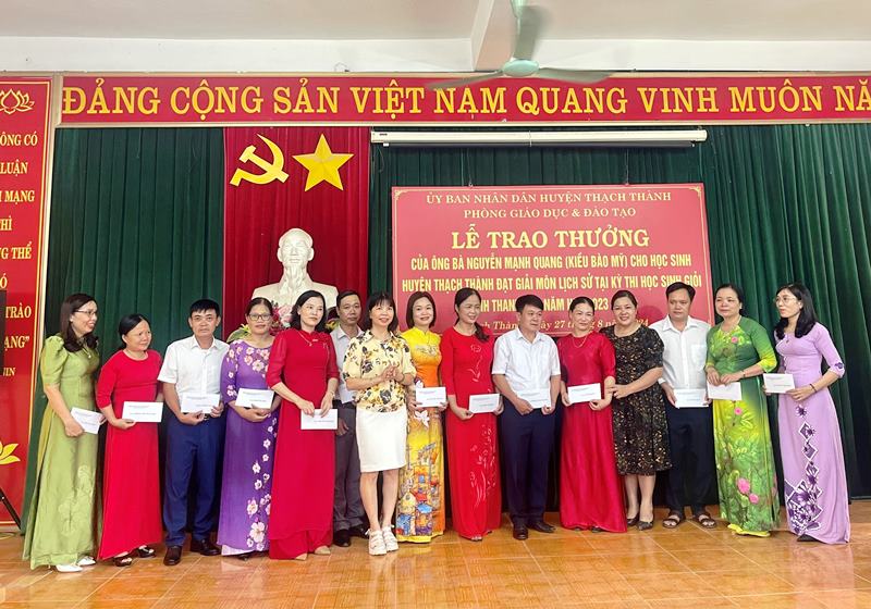 Ngày 26/8 vừa qua, tại Trung tâm chính trị huyện Thạch Thành, tỉnh Thanh Hóa diễn ra lễ trao tặng và phần thưởng cho giáo viên và học sinh huyện Thạch Thành đã có thành tích xuất sắc trong việc giảng dạy và học tập bộ môn lịch sử. Những phần thưởng này là tấm lòng của ông bà Nguyễn Mạnh Quang – Lý Thái Xuân (kiều bào ở Mỹ), với mong muốn cổ vũ, khích lệ niềm đam mê và tinh thần khám phá, học hỏi bộ môn lịch sử của thế hệ trẻ, bởi ông bà muốn các em hiểu được những gì mà cha ông đã trải qua, để rồi thấm nhuần lợi dạy “quốc gia hưng vong thất phu hữu trách” (nước nhà lúc hưng thịnh hay lúc suy vong, một người dân thường cũng phải có trách nhiệm lo lắng).