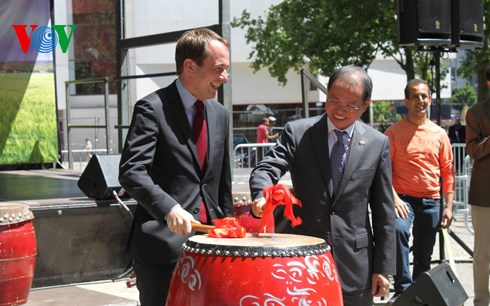 | Thị trưởng thành phố Montreuil và Đại sứ Việt Nam Nguyễn Ngọc Sơn cùng đánh trống khai mạc Lễ hội đoàn |