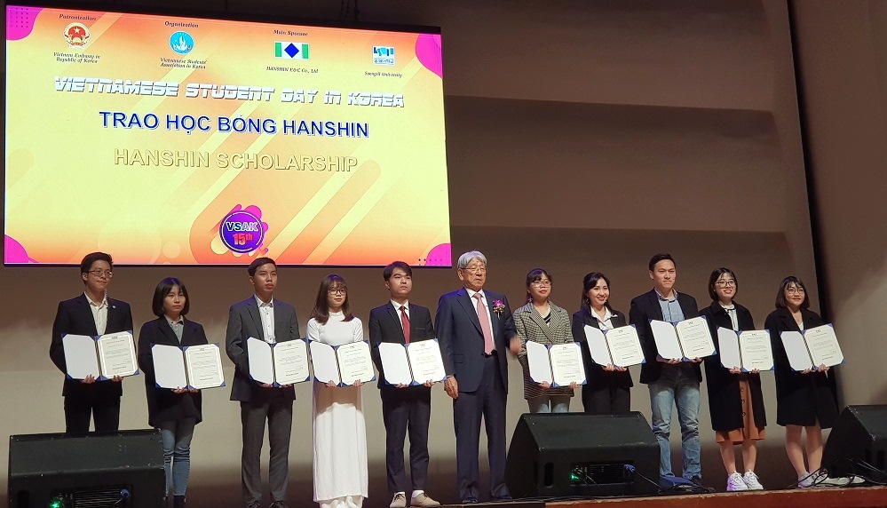 Ông Choi Yong-sun, Chủ tịch Tập đoàn Hanshin trao học bổng cho 10 sinh viên Việt Nam.