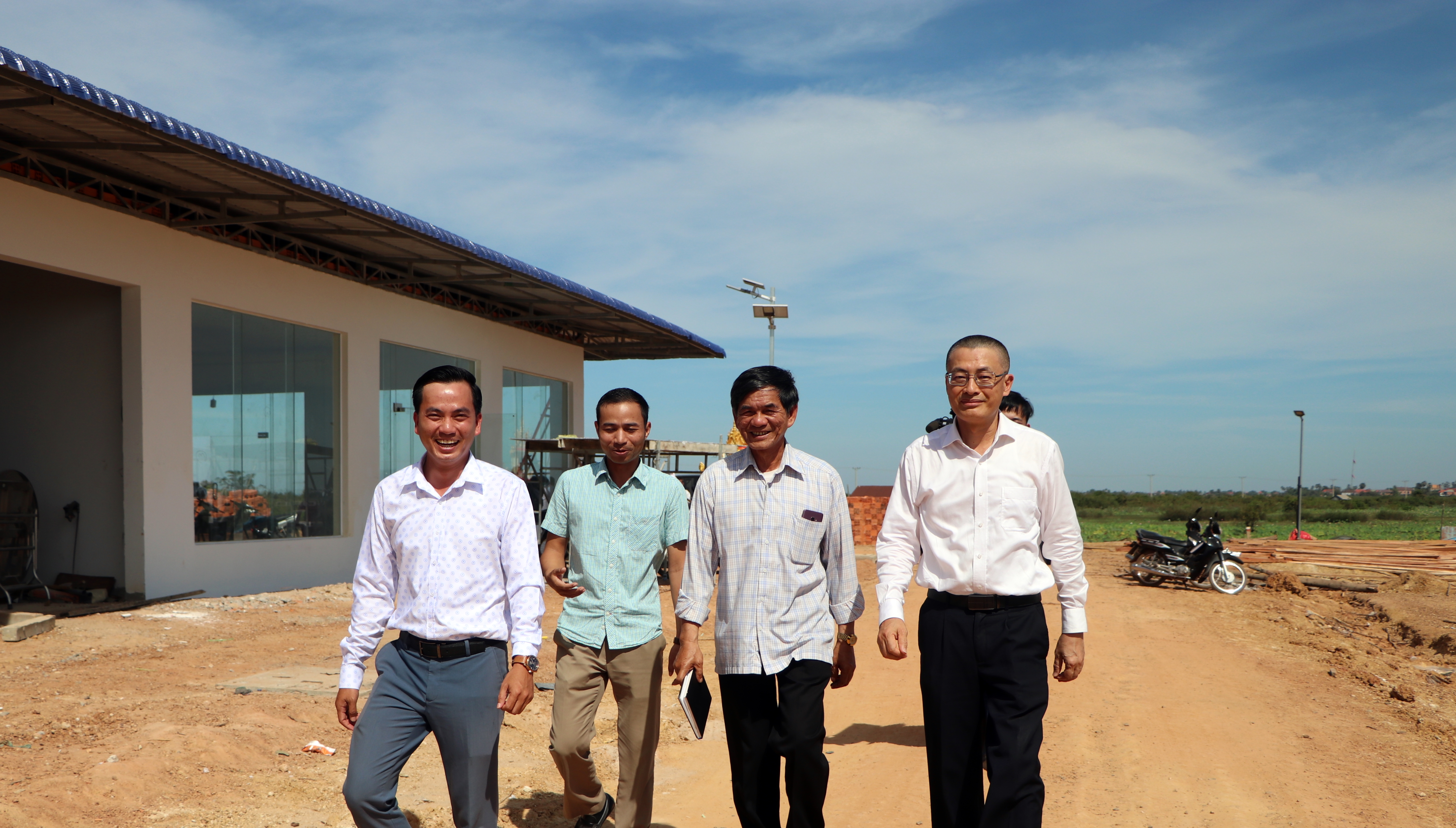 Đại sứ Vũ Quang Minh (bìa phải) đi tham quan khu dự án tái định cư tại Kampong Chhnang. |