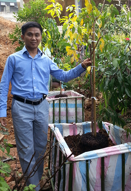| Anh Thắng bên một gốc đào vừa được trồng ở Đà Lạt. vnexpress.net |