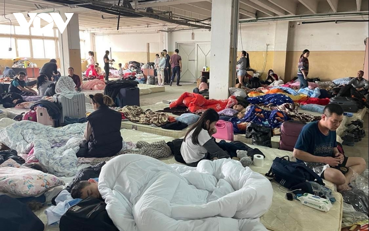Cách đó khoảng 45 phút di chuyển, một nhà máy cũ từ nhiều năm trước đang trong thời gian được cải tạo đã được sử dụng làm nơi tị nạn tạm thời cho gần 100 bà con người Việt. Những tấm nệm cũ được xếp xen kẽ, chật kín trong cả căn phòng hơn 200m2. Những ánh mắt chực chờ đã thấm mệt sau nhiều ngày chạy trốn khỏi khu vực xung đột.