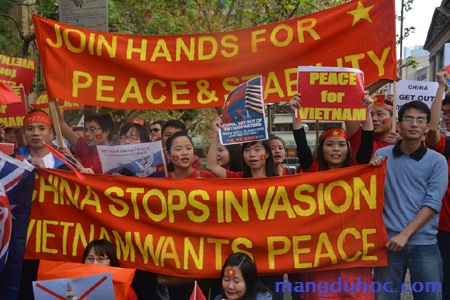 | Cộng đồng người Việt tại Sydney giơ cao những biểu ngữ phản đối hành động trái phép của Trung Quốc. |