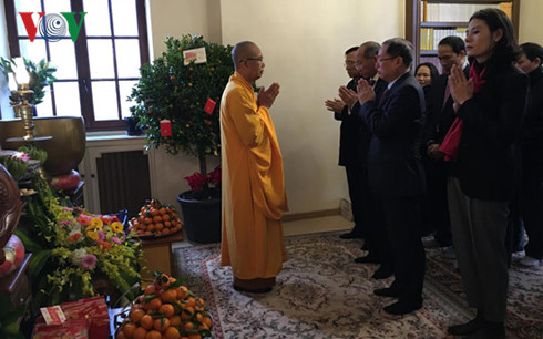 Ngày đầu tiên của Năm mới, cán bộ, nhân viên Đại sứ quán Việt Nam cùng các cán bộ các cơ quan đại diện Việt Nam tại Pháp thắp hương trước bàn thờ Chủ tịch Hồ Chí Minh trong khuôn viên Đại sứ quán. Sau đó, các cán bộ Đại sứ quán và các cơ quan đại diện cùng lên chùa làm lễ cầu an cho năm mới tại hai chùa Khuông Việt và Trúc Lâm Thiền viện. Tại chùa Khuông Việt, Thượng tọa Thích Tịnh Quang, trụ trì chùa Khuông Việt cầu chúc một năm mới bình an, dồi dào sức khỏe và nhiều thành công.