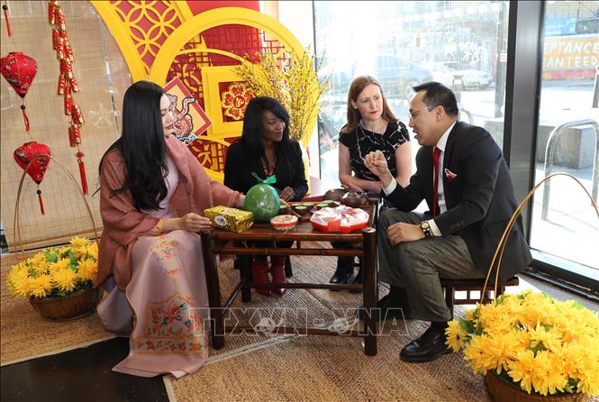 Đại sứ Việt Nam tại Anh Nguyễn Hoàng Long giới thiệu một số phong tục của người Việt trong dịp Tết Nguyên đán với bà Vicky Foxcroft, đại biểu Quốc hội khu vực Deptford (thứ 2 từ phải sang) và bà Debbie - Weekes, Phó thị trưởng thành phố London (thứ 2 từ trái sang).Ảnh: Đình Thư/PV TTXVN tại Vương quốc Anh |
