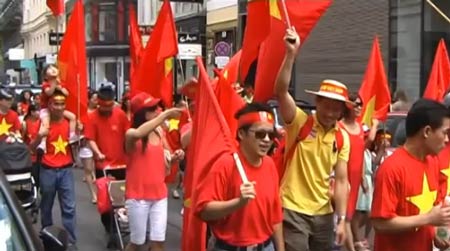 (VOV5) - Ngày 6/7, cộng đồng người Việt Nam tại Áo một lần nữa "nhộm đỏ" các đường phố phố của Thủ đô Vienna bằng cờ Tổ quốc để phản đối các hành vi ngày càng ngang ngược của Trung Quốc kể từ khi nước này hạ đặt trái phép giàn khoan Hải Dương 981 tại vùng đặc quyền kinh tế và thềm lục địa của Việt Nam.