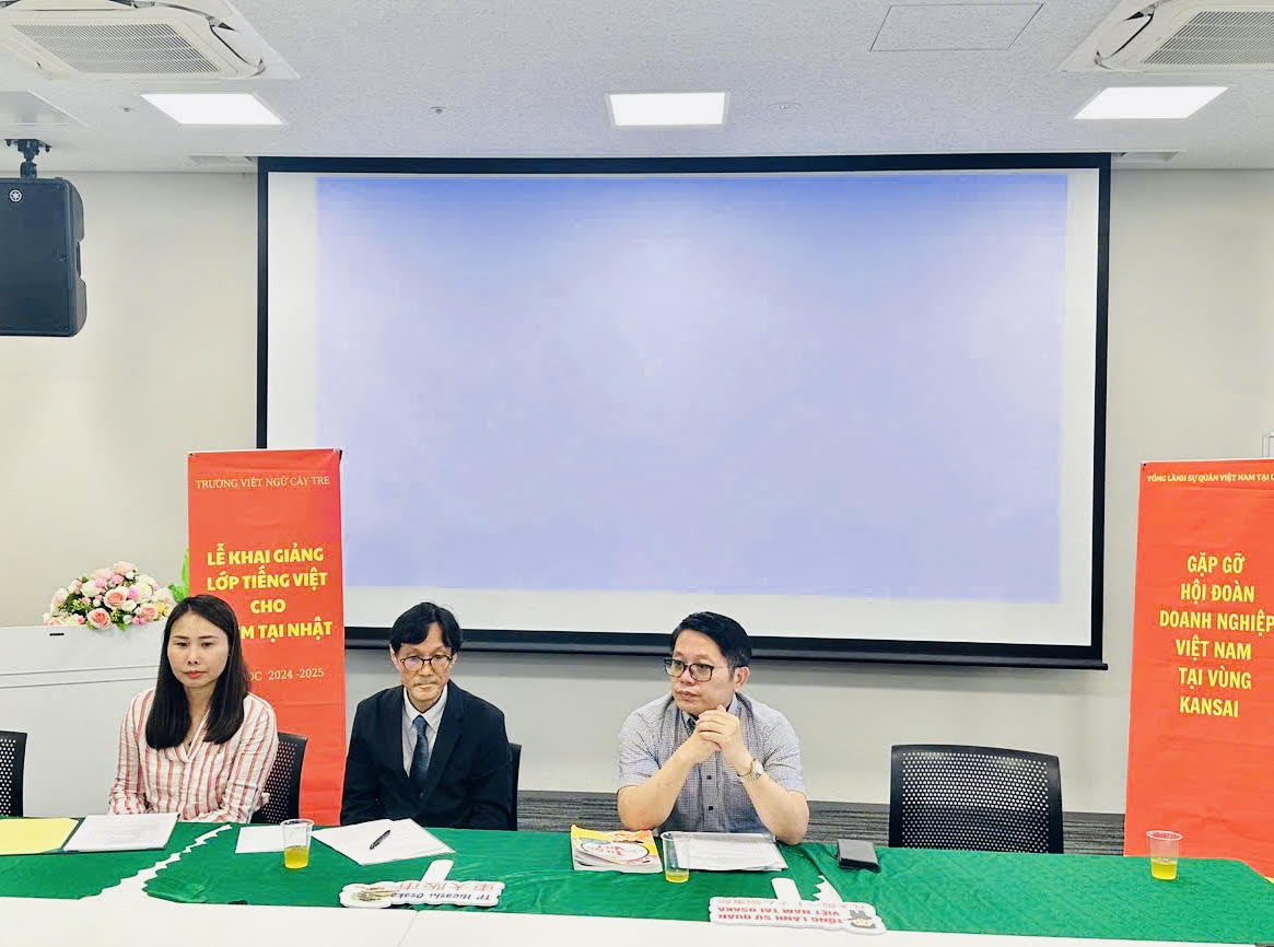 Từ phải qua: Ông Ngô Trịnh Hà, Tổng lãnh sự Việt Nam tại Kansai, Giáo sư Shimizu Masaaki, Trưởng bộ môn tiếng Việt Đại học Osaka, người sáng lập Trung tâm Việt Nam học, và bà Lê Thương, Chủ tịch Hội người Việt Nam vùng Kansai |