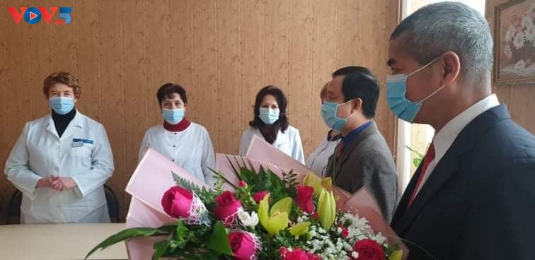 Hội Người Việt Kiev cảm ơn các bệnh viện đã chữa trị Covid cho bà con. - Ảnh: Hồ Sỹ Trúc.
