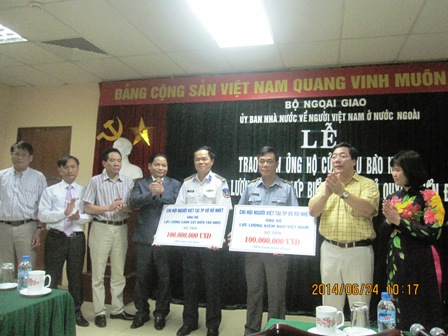 (VOV5) – Ngày 24/6, đại diện cộng đồng người Việt Nam tại Liên Bang Nga đã đến Ủy ban Nhà nước về người Việt Namở nước ngoài – Bộ ngoại giao trao số tiền bà con quyên góp để ủng hộ các lực lượng thực thi pháp luật trên biển của Việt Nam.