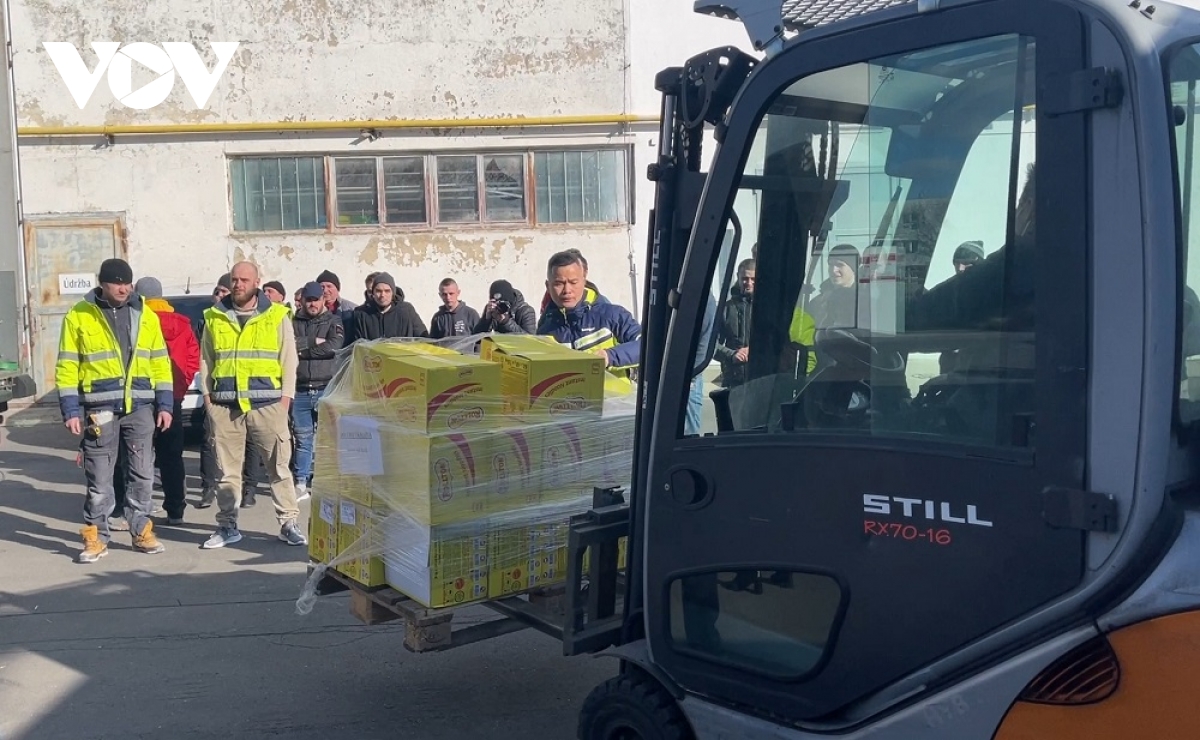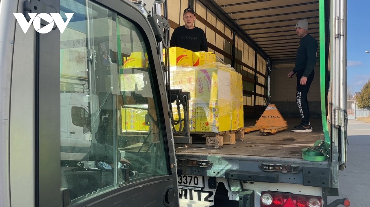 Các nhu yếu phẩm như mỳ ăn liền, nước uống, đồ hộp, vật dụng cá nhân, chăn ga gối, nệm và thiết bị y tế đã được đóng gói và gửi đến cho người dân và bà con người Việt đang tị nạn ở khu vực biên giới Slovakia và Ukraine.