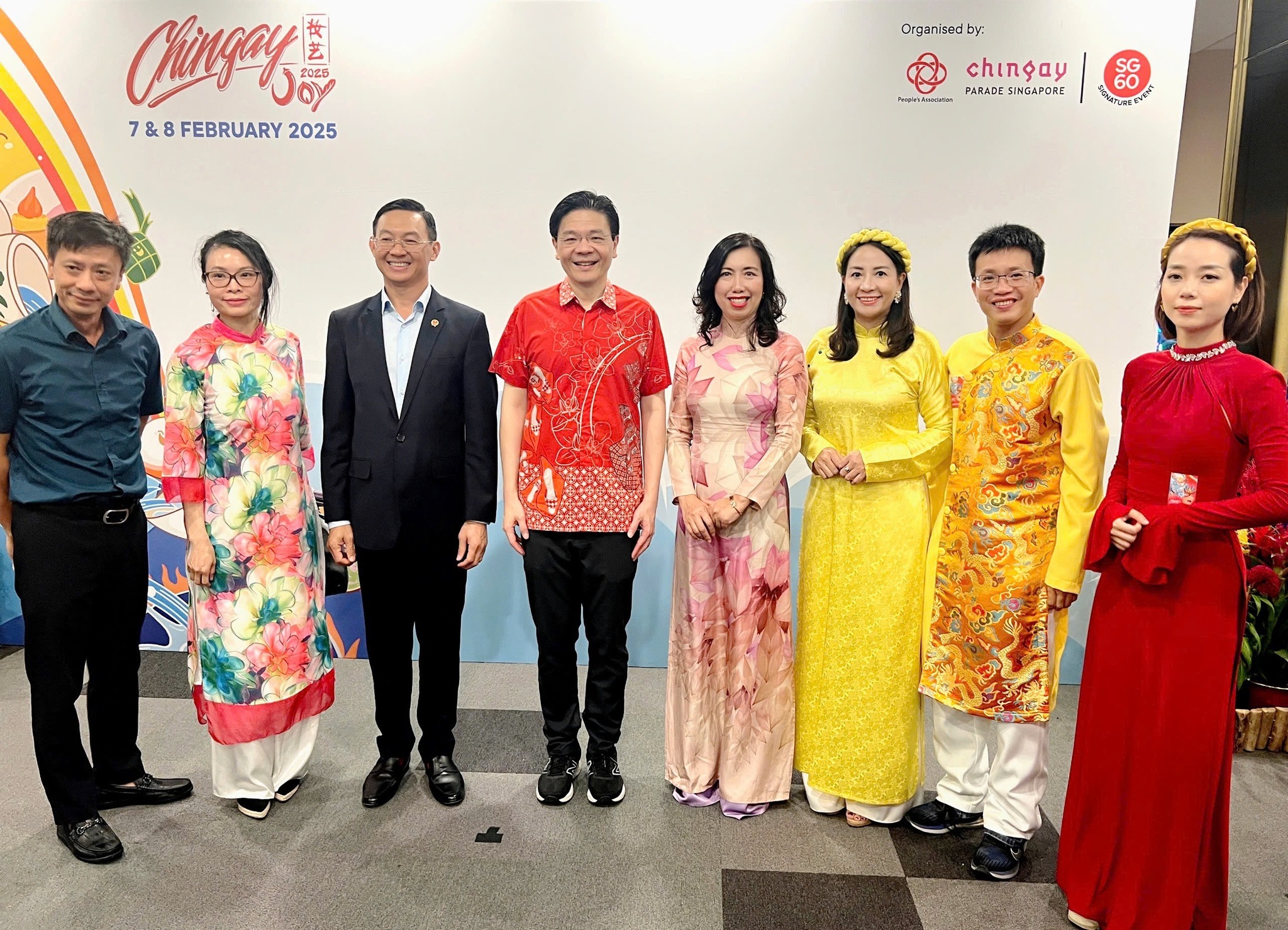 Thứ trưởng Bộ Ngoại giao Lê Thị Thu Hằng và Đại sứ Việt Nam tại Singapore Trần Phước Anh chụp ảnh lưu niệm cùng đoàn biểu diễn của cộng đồng người Việt tại Singapore ở Lễ hội Chingay 2025. |
