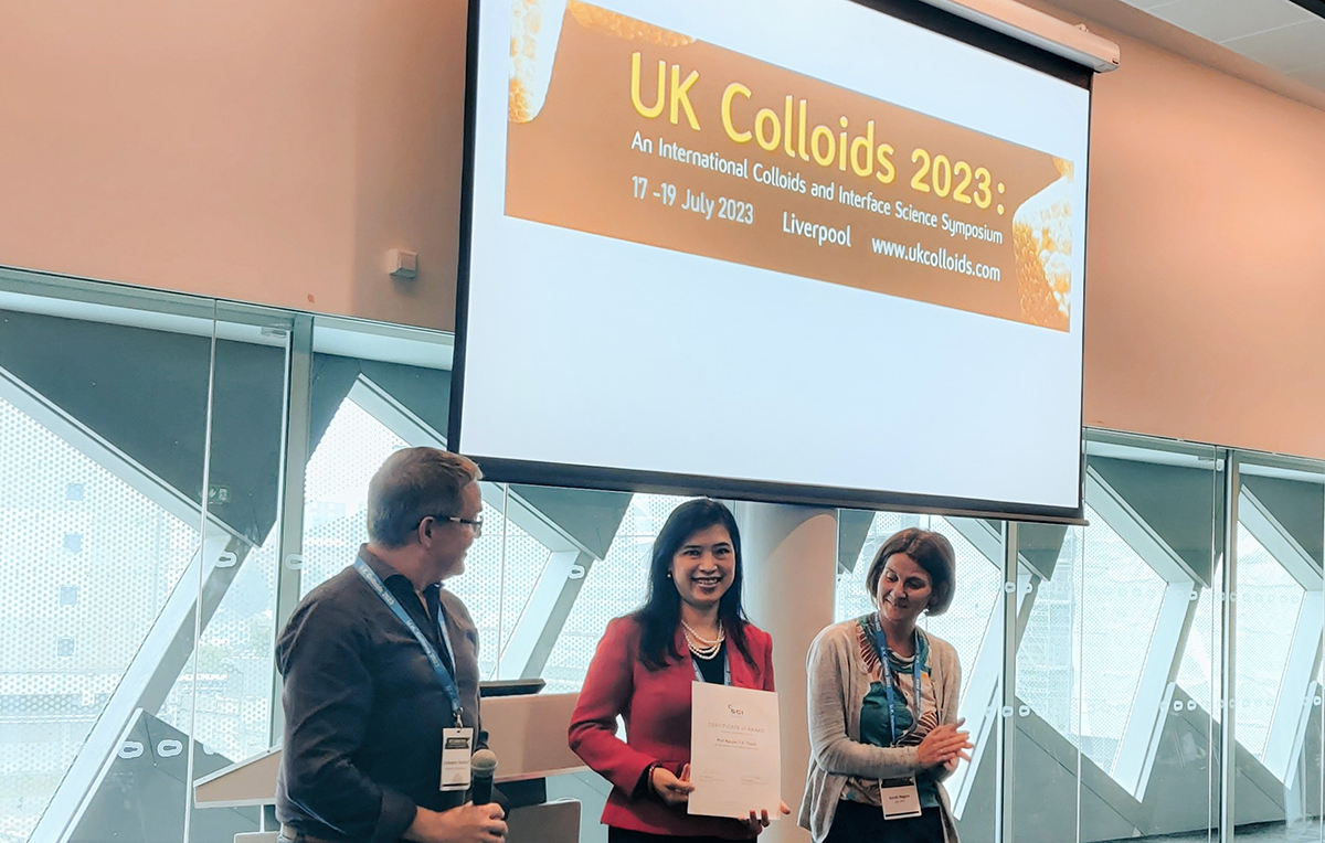Tại hội nghị khoa học UK Colloids 2023, diễn ra từ ngày 17-19/7 vừa qua ở Liverpool, Anh, Giáo sư Nguyễn Thị Kim Thanh đã thuyết trình trước 400 nhà khoa học từ khắp nơi trên thế giới. Bài thuyết giảng nhận được sự quan tâm, đánh giá rất cao của các nhà khoa học, chuyên gia đầu ngành trong lĩnh vực hóa keo tham dự hội nghị.