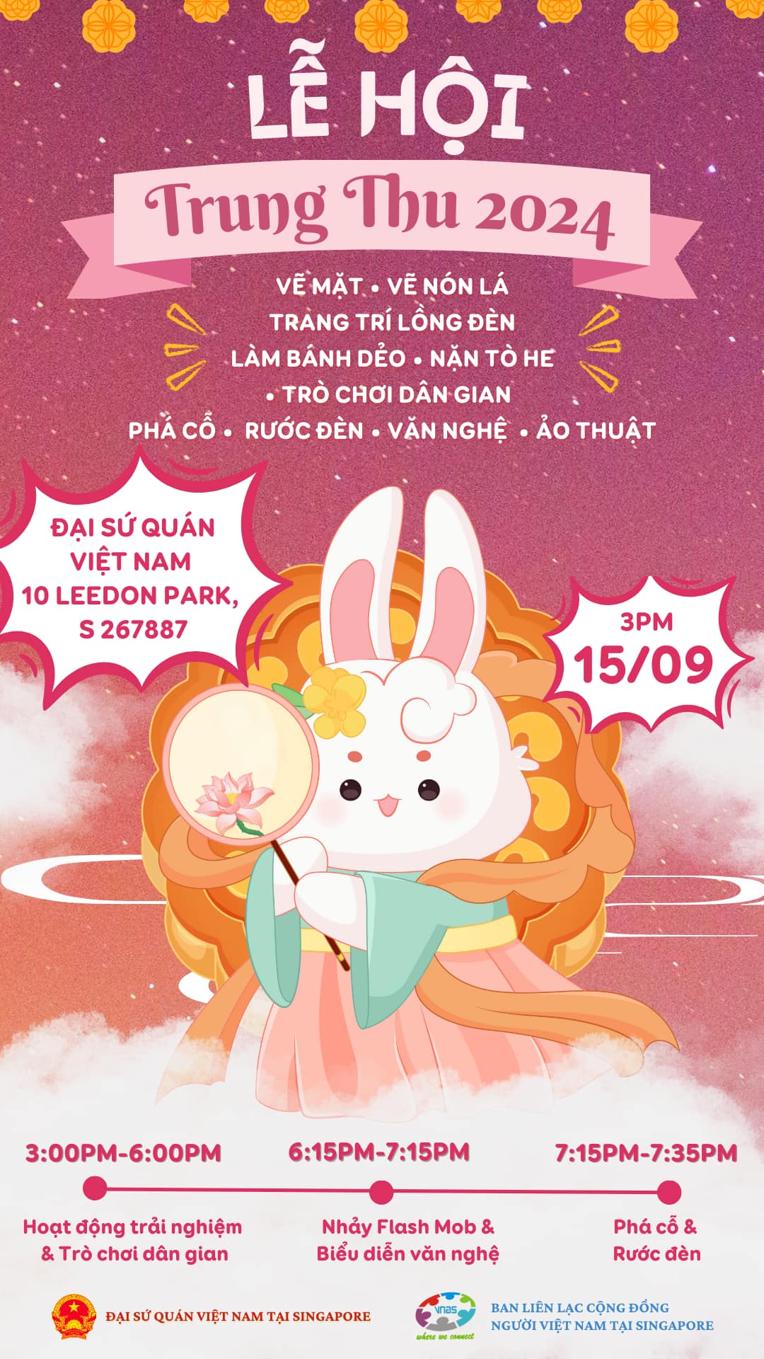 Ngày 15/09/2024, Lễ hội Trung thu 2024 sẽ diễn ra tại Đại sứ quán Việt Nam ở Singapore. Sự kiện này do Ban Liên lạc Cộng đồng Người Việt Nam tại Singapore (VNAS) tổ chức, hứa hẹn mang đến nhiều hoạt động văn hóa đặc sắc cho cộng đồng người Việt và bạn bè quốc tế.