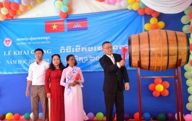 Đại sứ Vũ Quang Minh đánh trống khai trường năm học 2018-2019. Ảnh: nhandan.vn |
