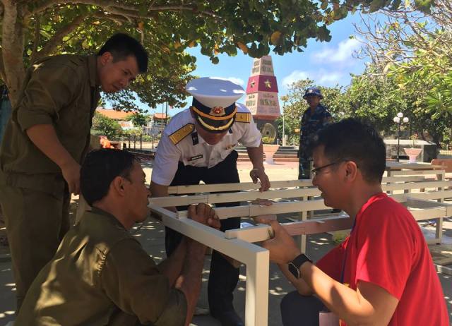 | Anh Phạm Trung Kiên cùng các cán bộ, chiến sĩ trên đảo Trường Sa đang lắp ghép bàn họp là quà tặng của công ty VinaCorp. |