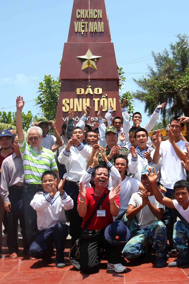 | Anh Thế Sáng (áo đỏ) cùng đoàn kiều bào và lính đảo |