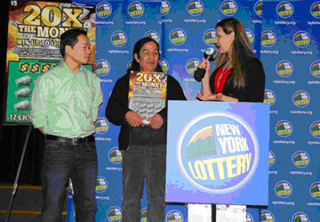 | Tân triệu phú Trần Hùng (giữa) trúng vé số cào ở New York 1 triệu USD vào tháng 2-2012. |