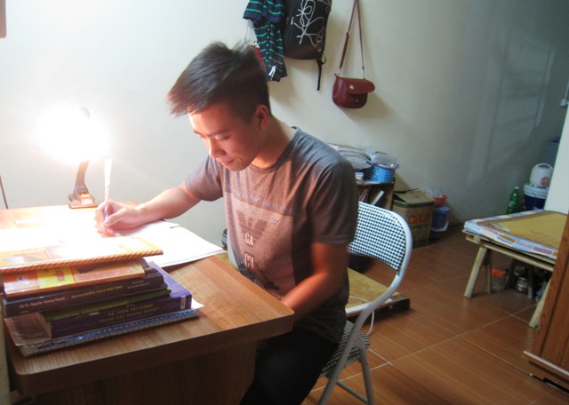 | Lê Đức Thắng đang học bài tại căn hộ mà anh Nguyễn Văn Cường cấp cho trong vòng 5 năm |