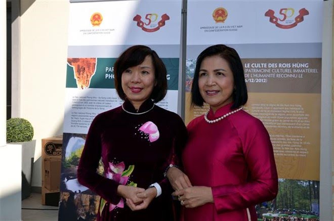 Đại sứ Lê Thị Tuyết Mai (phải) và Đại sứ Lê Linh Lan trong Ngày văn hóa Việt Nam tại Thụy Sĩ, hồi tháng 10/2021. Ảnh: Tố Uyên/TTXVN |