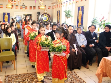 Không khí trang nghiêm, thanh tịnh và hết sức ấm cúng trong tiếng trống Bát nhã, điệu múa dâng hoa cúng Chư phật của các cháu thiếu niên, những bài pháp thoại quyện với tiếng đàn bầu, đàn tranh khiến toàn thể hội trường tạm thời quên đi cái rét thấu xương của ngày đông Châu Âu. Ai ai cũng có cảm giác như mình đang được ngồi ở ngôi chùa trên chính quê hương Việt Nam, nơi có mái ngói cong cong và lũy tre làng mang làn gió nhè nhẹ…thật gần gũi và ấm áp!