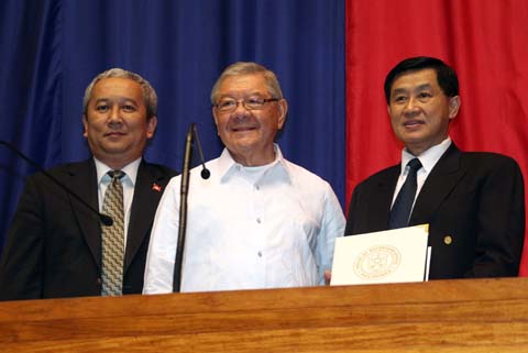 | Chủ tịch Hạ viện Philippines Sonny Belmonte trao nghị quyết vinh danh ông Johnathan Hạnh Nguyễn (phải). Ảnh do ĐSQ Việt Nam tại Philippines cung cấp. |