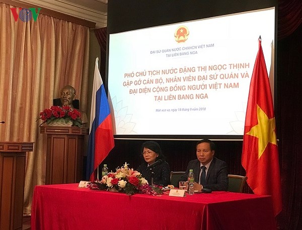 Từ 18 - 22/09, nhân dịp sang Liên bang Nga tham dự Diễn đàn phụ nữ Á-Âu lần thứ hai, được tổ chức tại thành phố Saint Peterburg, tối 18/9, Phó chủ tịch nước Đặng Thị Ngọc Thịnh đến thăm và nói chuyện với cán bộ nhân viên Đại sứ quán, đại diện cộng đồng người Việt Nam tại Liên bang Nga.