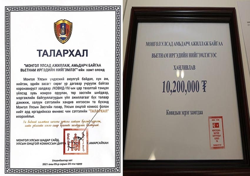 Thư cảm ơn của Phó Thủ tướng Mông Cổ S.Amarsaikhan gửi Cộng đồng người Việt Nam tại Mông Cổ (bên trái) và biển trao tương trưng số tiền trị giá 10,200 nghìn MNT (tương đương 3,500 USD) ủng hộ Mông Cổ chung tay chống đại dịch Covid 19 - Ảnh: baoquocte.vn |