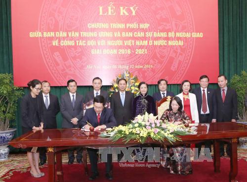 (VOV5) - Chiều 6/12, tại Hà Nội diễn ra Lễ ký “Chương trình phối hợp giữa Ban Dân vận Trung ương và Ban Cán sự Đảng Bộ Ngoại giao về công tác đối với người Việt Nam ở nước ngoài giai đoạn 2016 - 2021”.