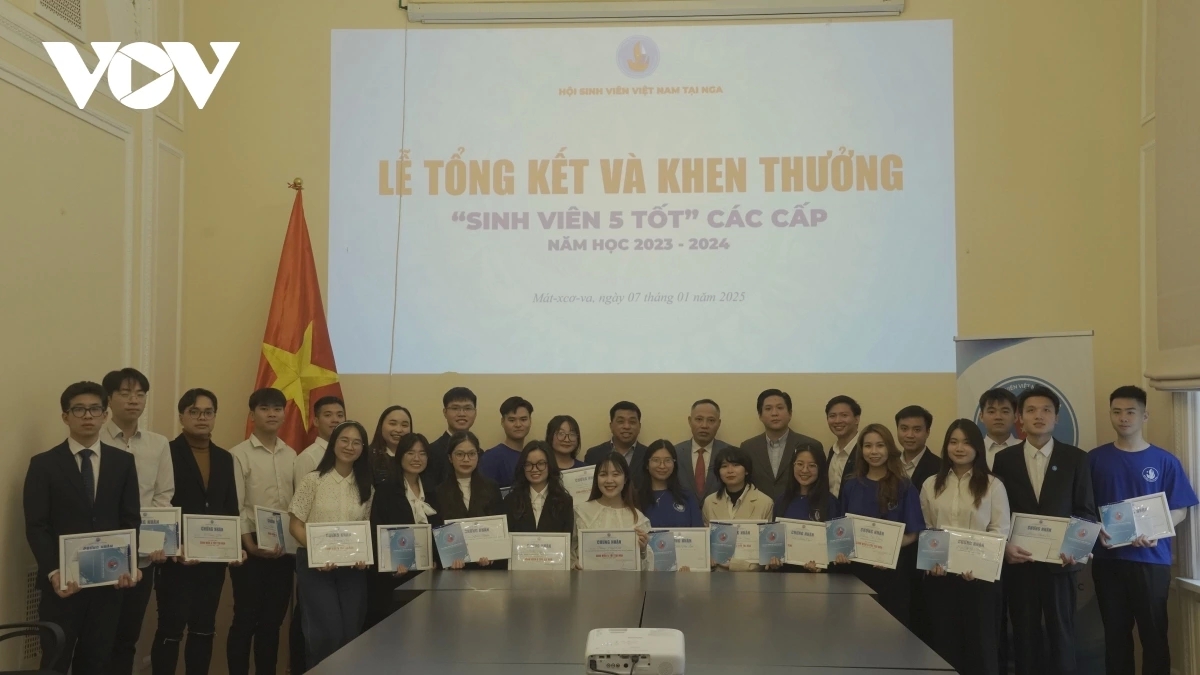 Tuyên dương sinh viên đạt danh hiệu "Sinh viên 5 tốt" năm 2024 tại Nga. Ảnh: VOV |