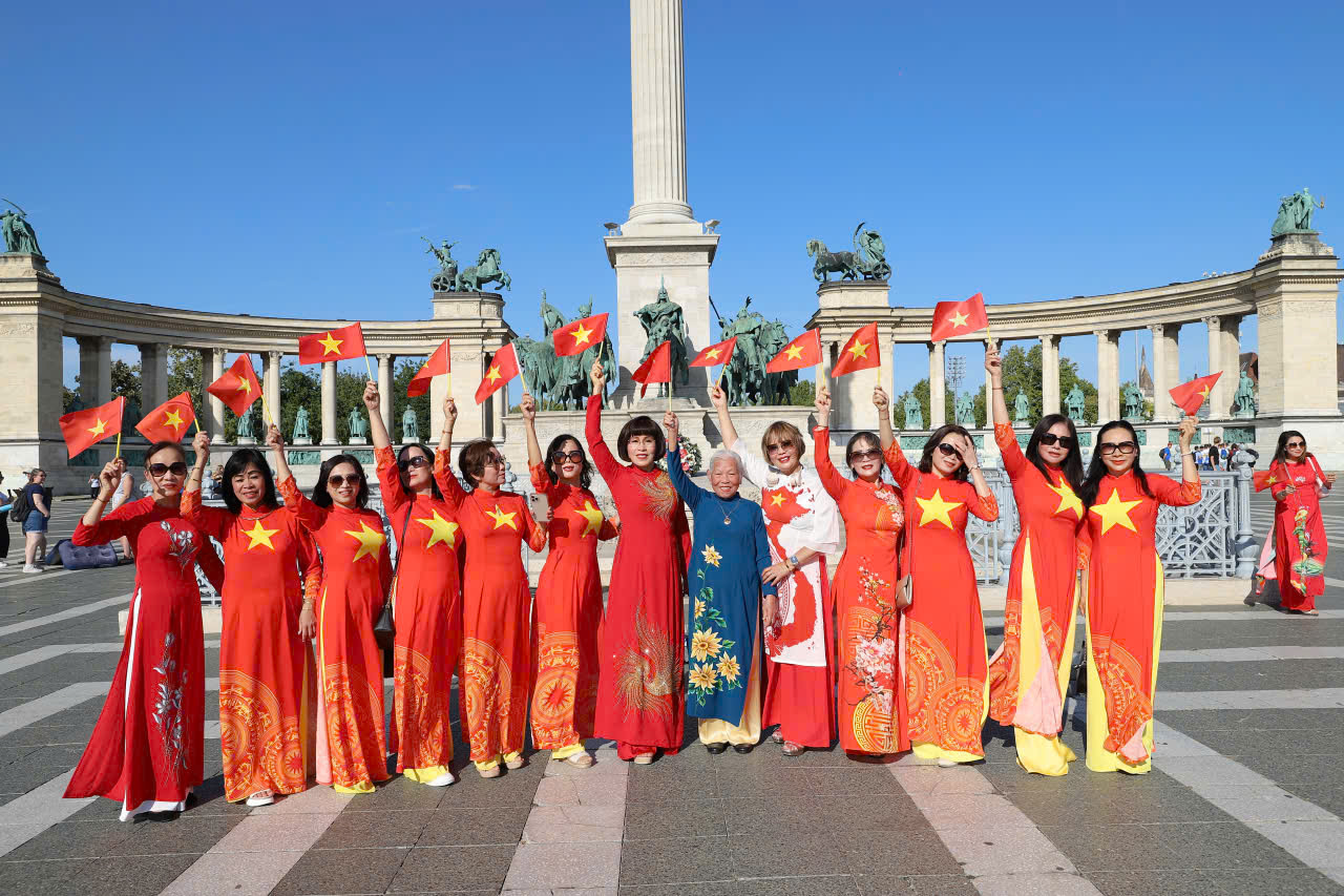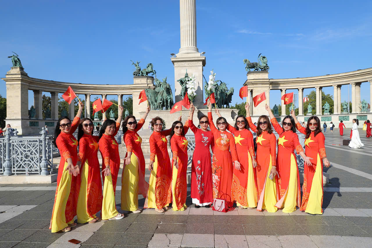 Hòa chung không khí mừng dịp Lễ trọng đại của dân tộc, kỷ niệm 80 năm Cách mạng tháng 8 (19/8/1945 - 199/8/2025) và 80 năm Quốc khánh (2/9/1945 -2/9/2025), chiều 2/9/2025, Hội Phụ nữ Việt Nam tại Hungary tổ chức diễu hành áo dài tại Quảng trường Anh hùng, thành phố Budapest.
