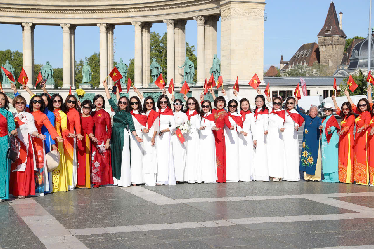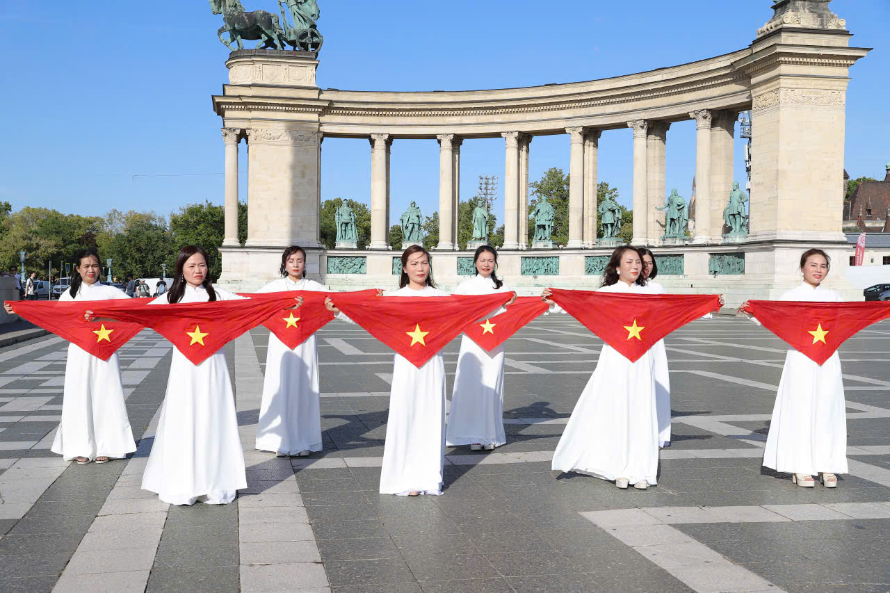 Trong ánh nắng đầu thu hàng trăm chị em trong tà áo dài truyền thống duyên dáng với những lá cờ đỏ sao vàng tung bay đã đưa những hình ảnh tươi đẹp của Việt Nam đến giữa trung tâm thủ đô Hungary. Chị em đã trình diễn những điệu múa về Tổ Quốc như lời gửi gắm tình cảm về quê hương trong ngày lịch sử trọng đại của dân tộc.