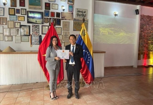 Đại sứ Lê Viết Duyên đã trao Giấy chứng nhận cho chủ cửa hàng kem, bà Isbellis Da Silva. Ảnh: TTXVN |
