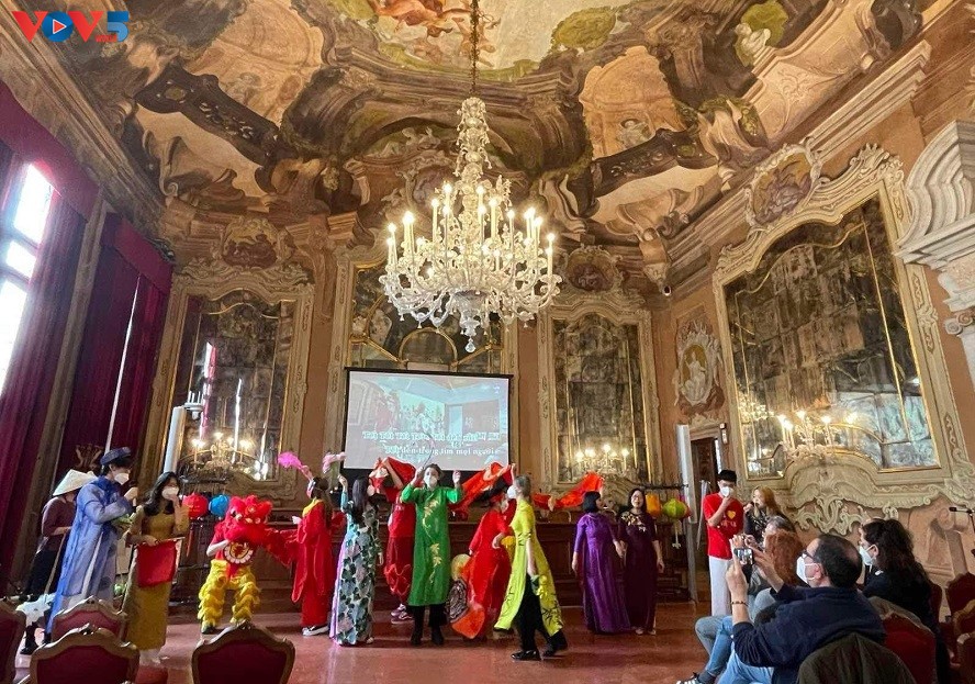 Sau đó, cả khán phòng bừng lên bầu không khí rộn ràng với liên khúc Dòng máu Lạc Hồng và Ngày Tết quê em, màn trình diễn trang phục dân tộc Việt Nam với điểm nhấn là áo dài, áo tứ thân, áo bà ba, bài “Nối vòng tay lớn” của nhạc sĩ Trịnh Công Sơn, do hơn 20 em sinh viên Italy trình bày, cùng với sự tham gia của các bạn sinh viên Việt Nam đang du học tại trường.