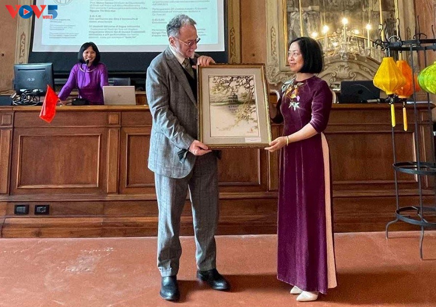 Đại sứ Nguyễn Thị Bích Huệ trao quà lưu niệm cho lãnh đạo Khoa châu Á và Bắc Phi học, Trường Đại học Ca’ Foscari. Ảnh: PV VOV tại Italy |