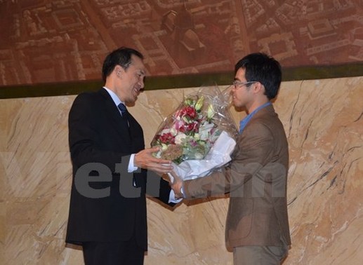 | Đại diện ĐSQ Việt Nam tại Pháp (trái) trao tặng hoa cho anh Phạm Thành Trung, Chủ tịch Quỹ "Đồng hành." (Ảnh: Bích Hà/Vietnam+) |