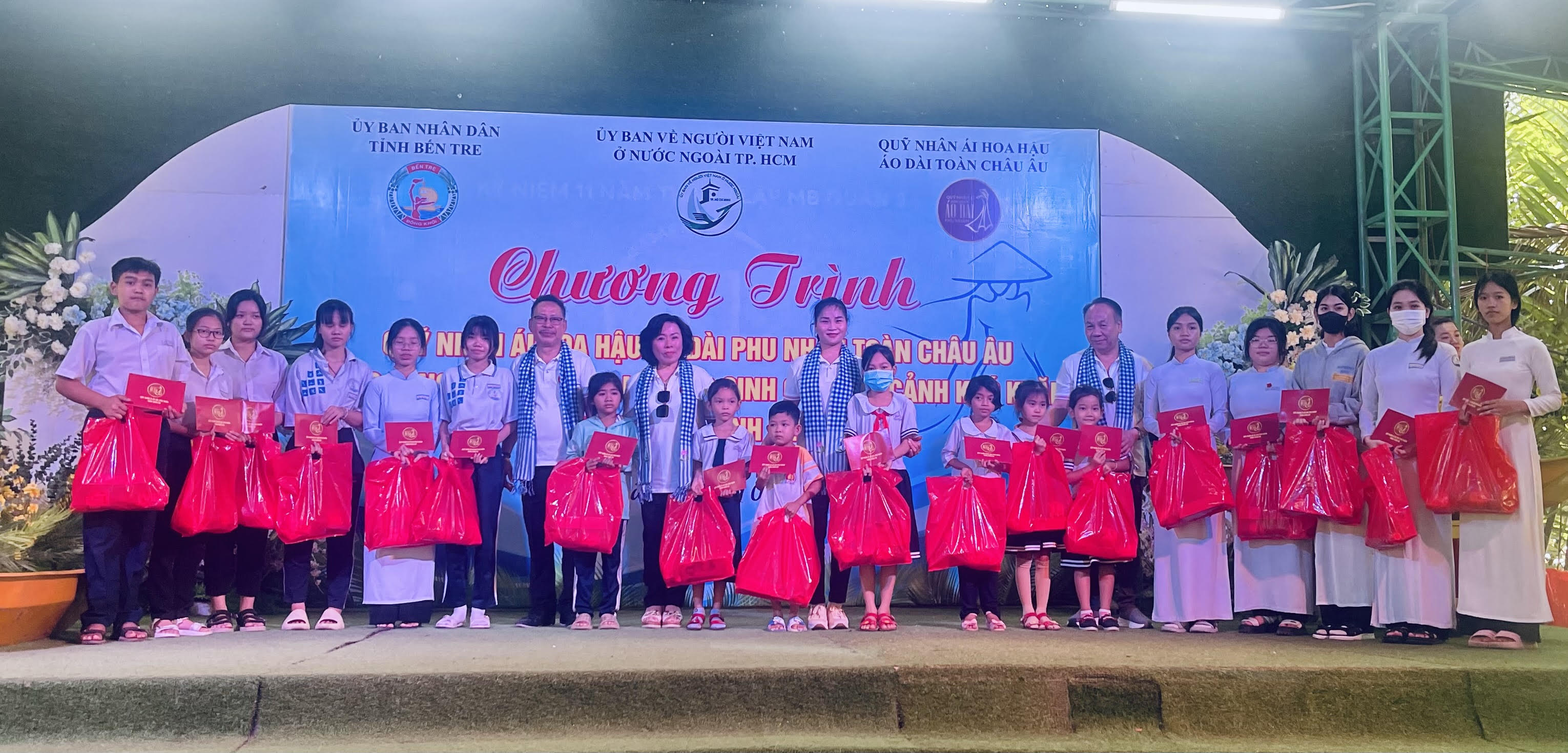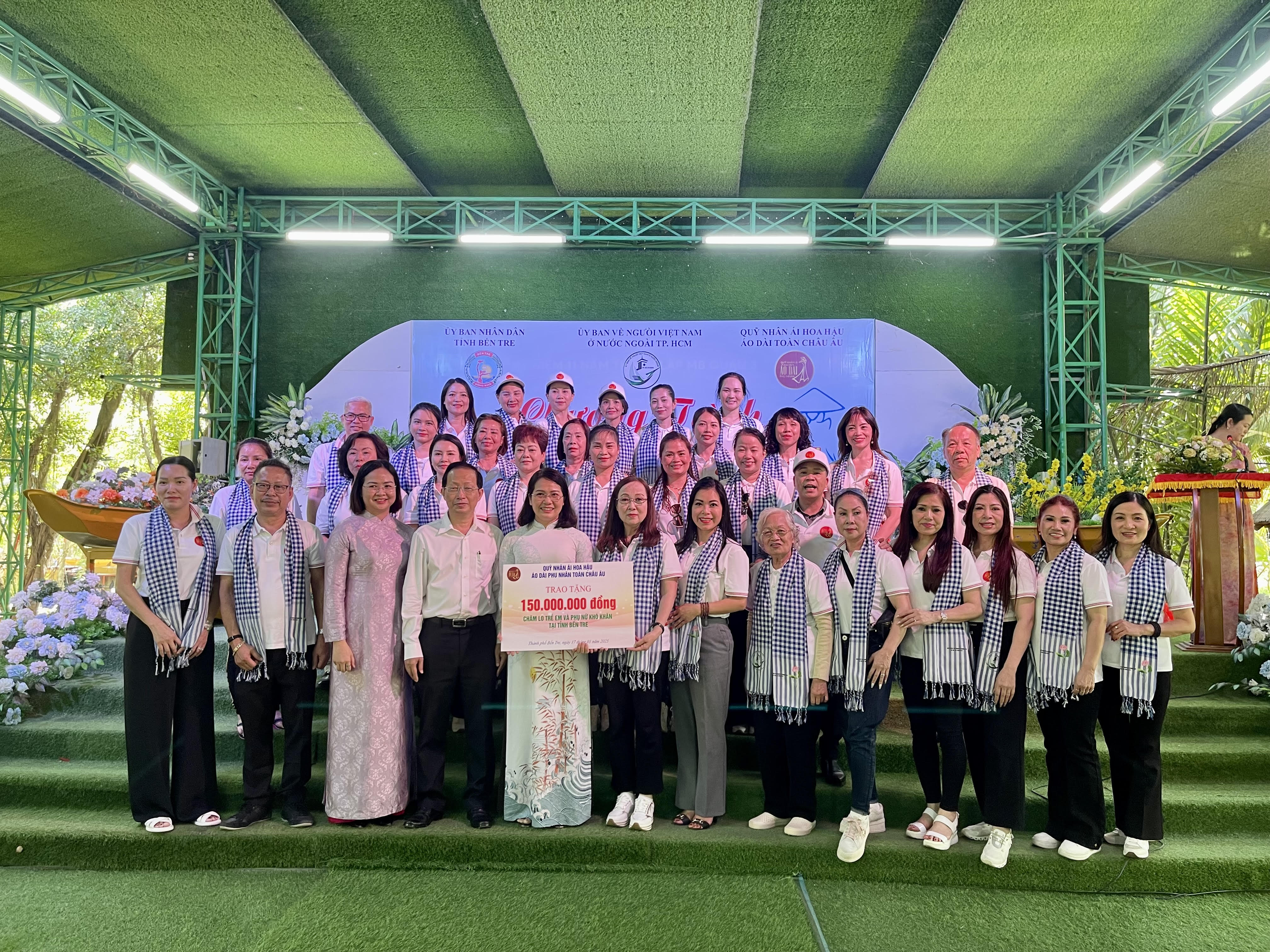 Tại đây, đoàn đã trao tặng 150 phần quà cho các chị em phụ nữ và các em học sinh có hoàn cảnh khó khăn tại địa phương. Tiếp nhận sự sẻ chia của những tấm lòng kiều bào xa xứ, bà Lê Thị Hoàng Oanh, Phó Chủ tịch Hội liên hiệp phụ nữ Việt Nam tỉnh Bến Tre cho biết: "Mỗi dịp Tết nguyên đán, chúng tôi vẫn thường kêu gọi sự chung tay của các tổ chức, cá nhân ở trong và ngoài tỉnh để cùng chăm lo cho các gia đình hội viên còn gặp khó khăn. Đây là lần đầu tiên Hội phụ nữ Bến Tre được tiếp nhận sự hỗ trợ từ Quỹ nhân ái - Hoa hậu Áo dài phu nhân toàn châu Âu. Điều này mang đến cảm xúc rất đặc biệt khi các anh chị là những người con xa quê trở về quê hương làm công tác thiện nguyện. Dù lần đầu gặp gỡ nhưng chúng tôi thấy như rất gần gũi bởi các anh chị đã đồng cảm với hoàn cảnh khó khăn của các bà con ở đây, hoà mình vào không khí của buổi trao tặng quà, đầy yêu thương và gần gũi. Sự sẻ chia của Quỹ làm cho chúng tôi như được tiếp thêm động lực để chúng tôi tiếp tục cố gắng trong công tác của mình, bởi vì chúng tôi biết rằng sẽ luôn có sự ủng hộ của những người em, người chị ở nước ngoài".