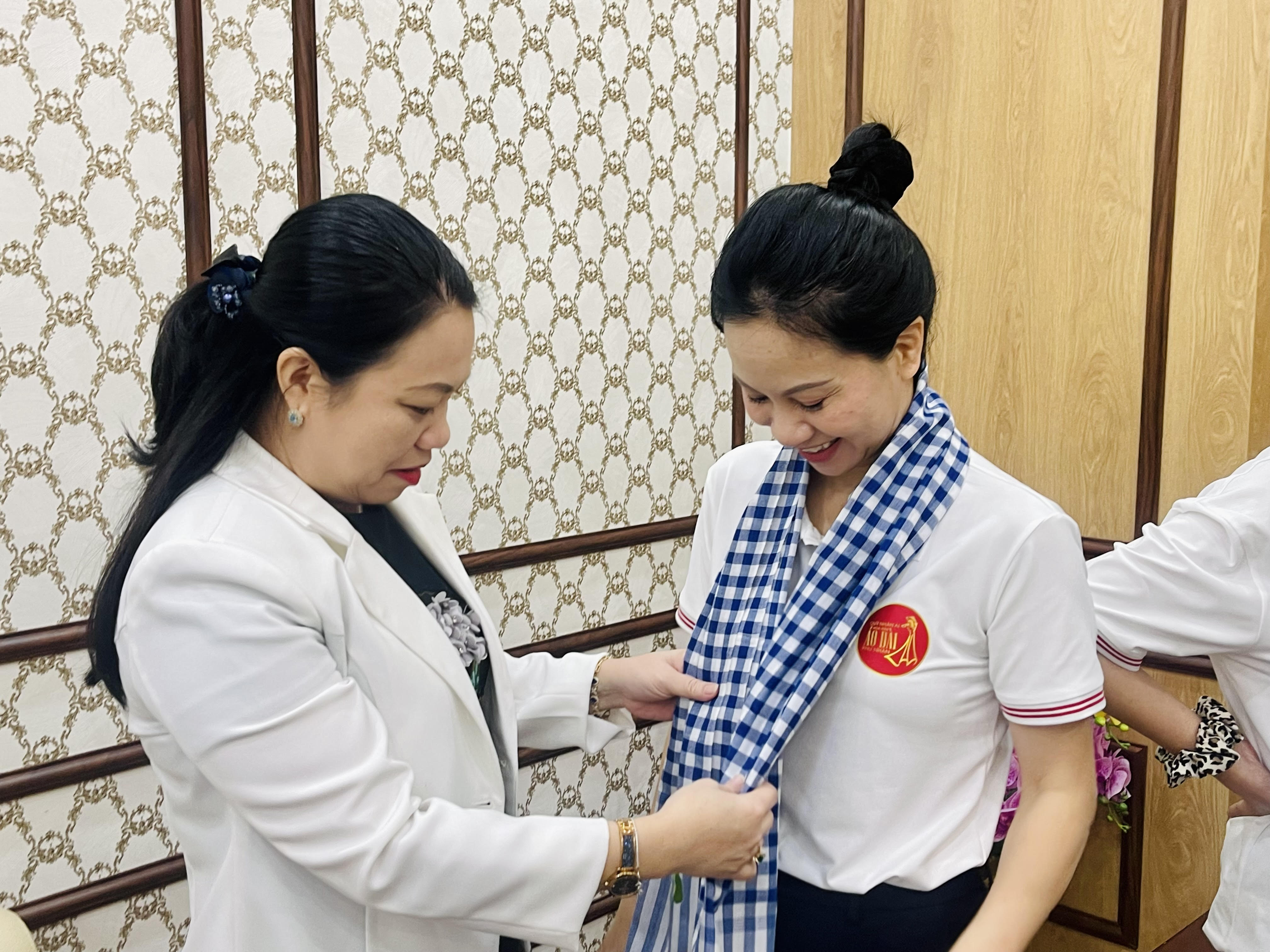 Bà Vũ Thị Huỳnh Mai, Chủ nhiệm Ủy ban về người VN ở nước ngoài TPHCM tặng khăn rằn cho các thành viên của Quỹ nhân ái |
