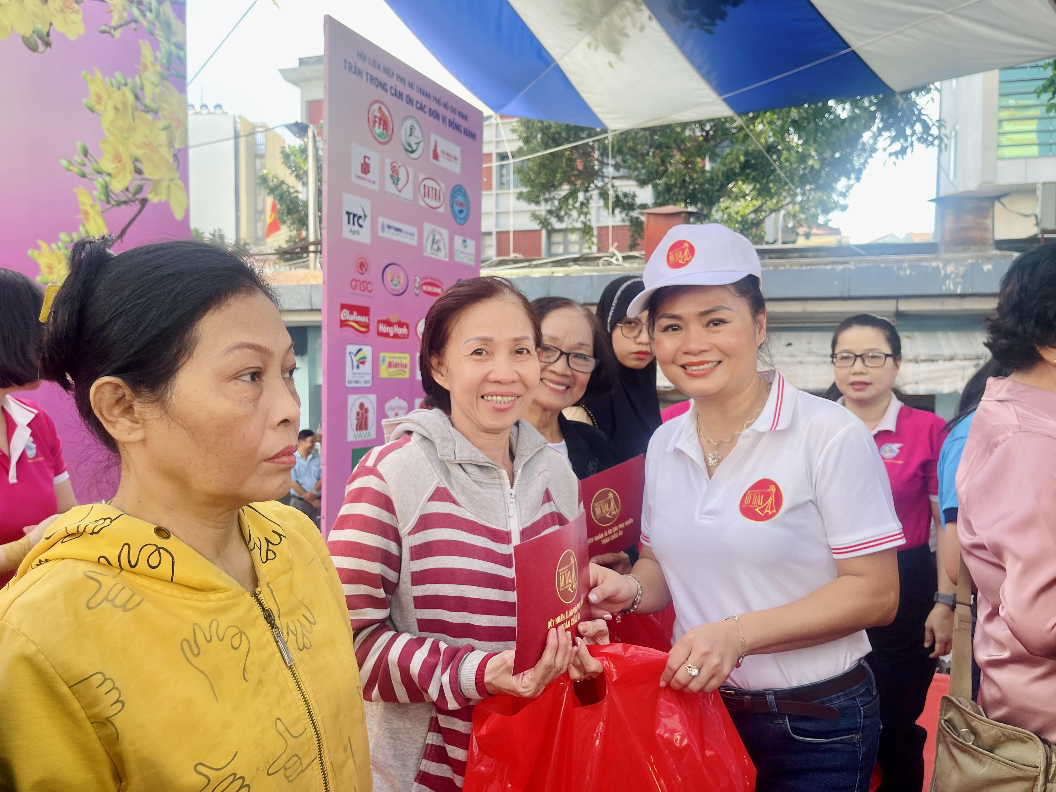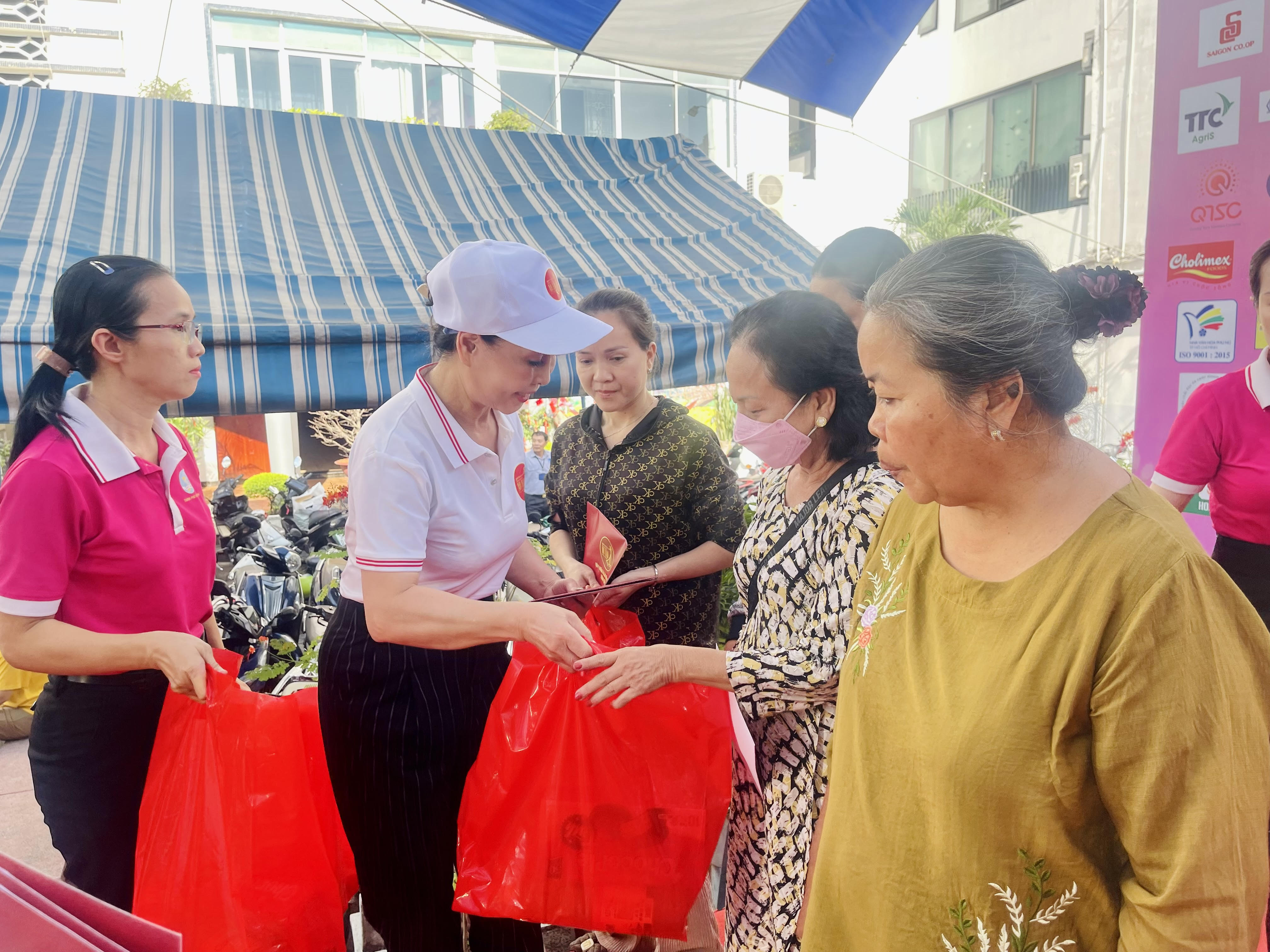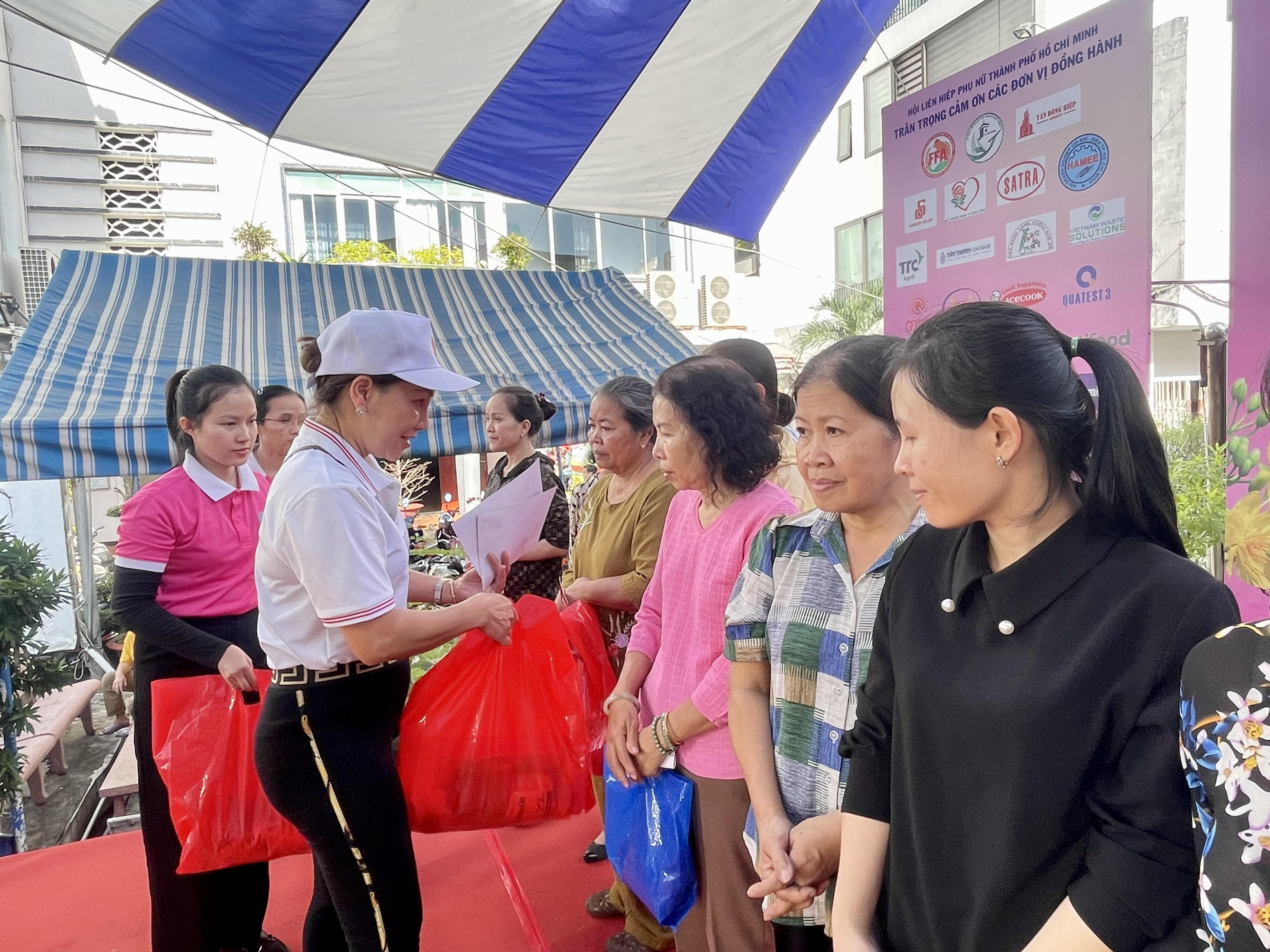 Bà Trần Thị Phương Hoa, Phó chủ tịch Hội Liên hiệp phụ nữ TPHCM cùng các thành viên Quỹ nhân ái trao tặng quà cho phụ nữ nghèo |